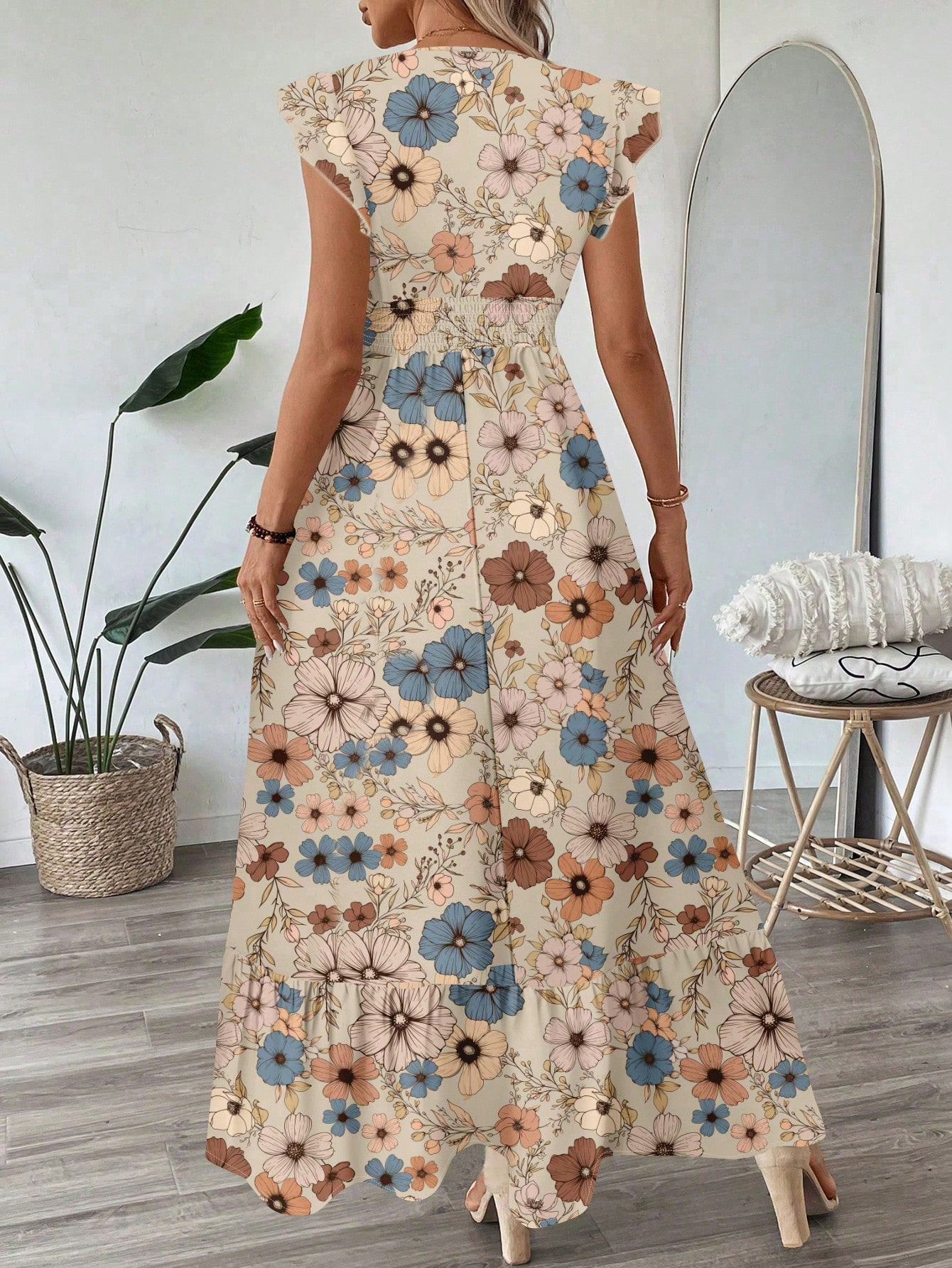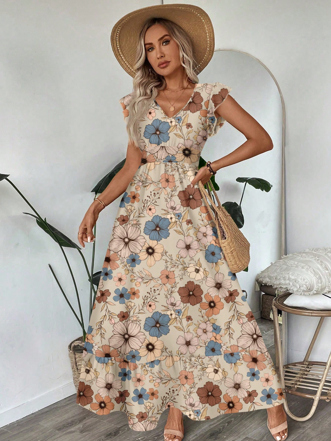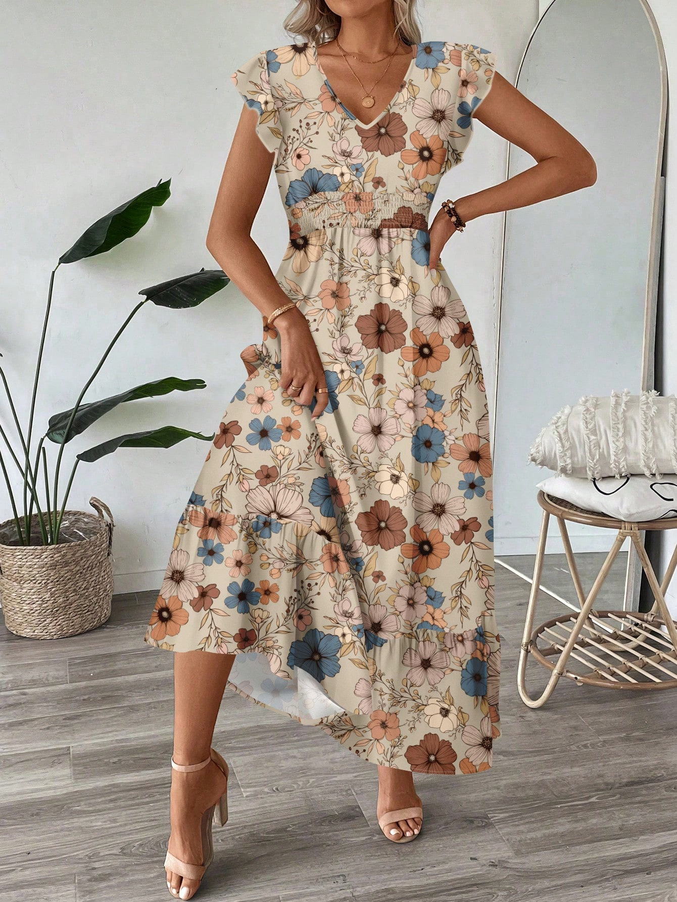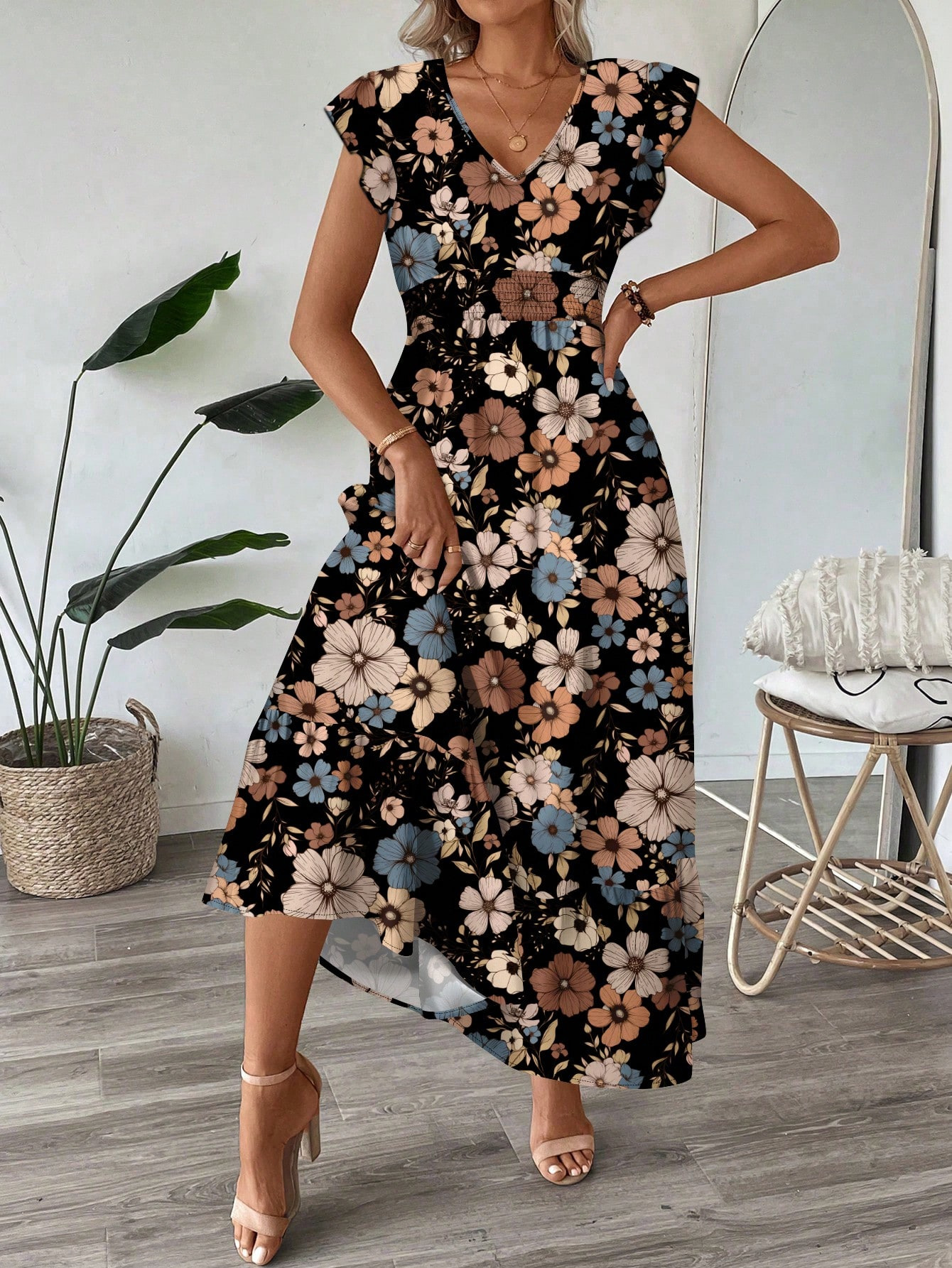 Printed V-neck Flared Sleeve Long Dress