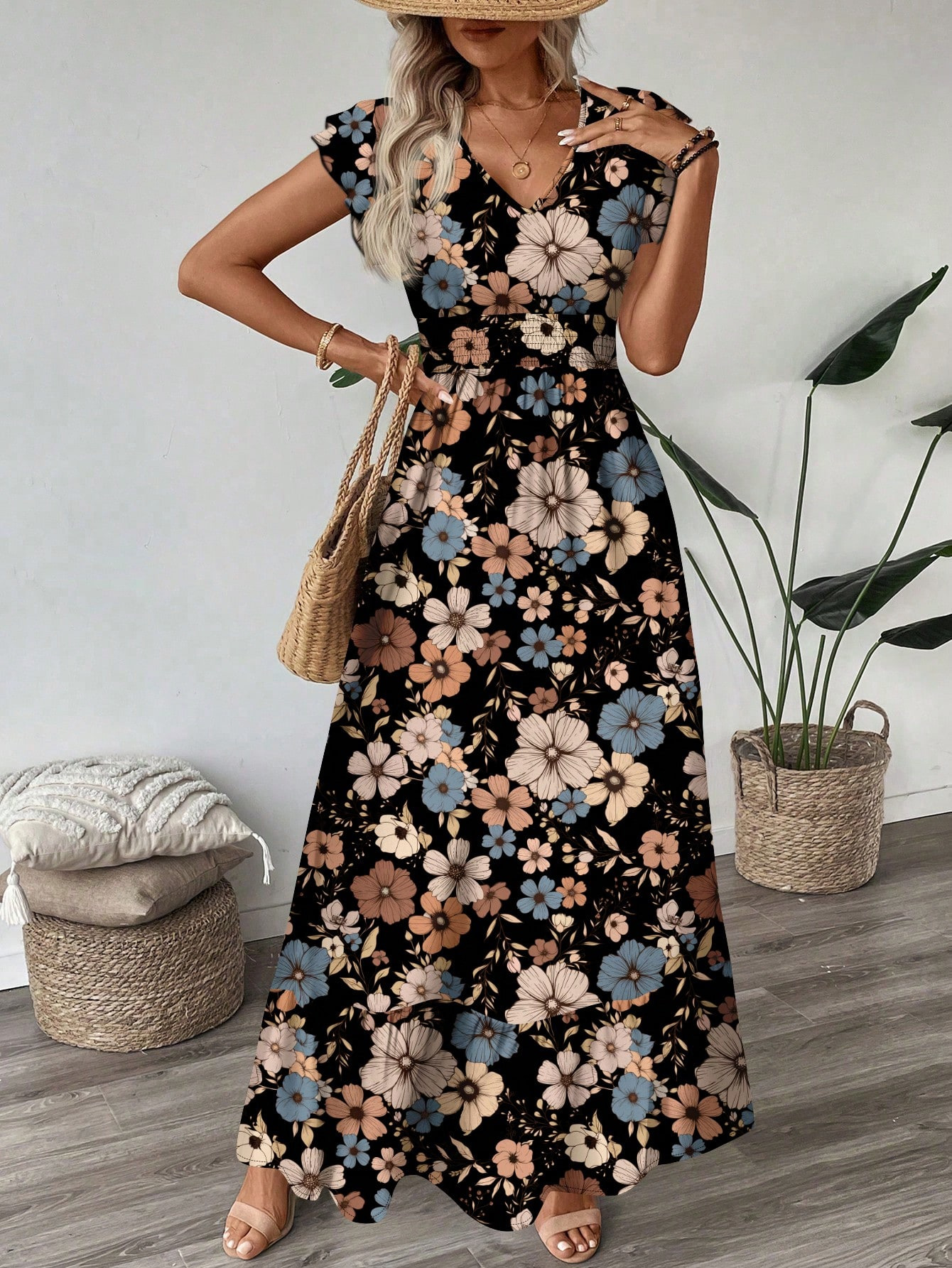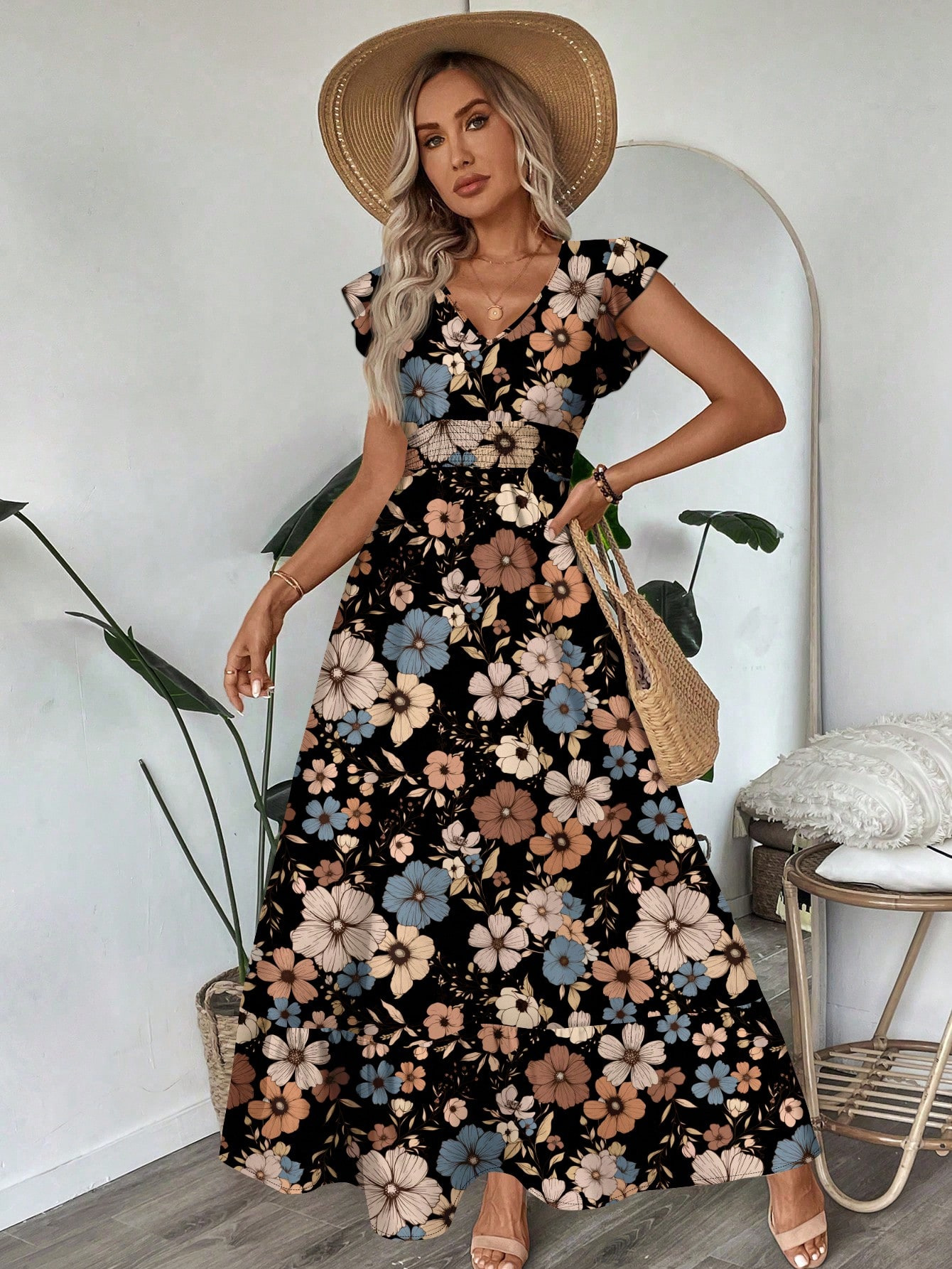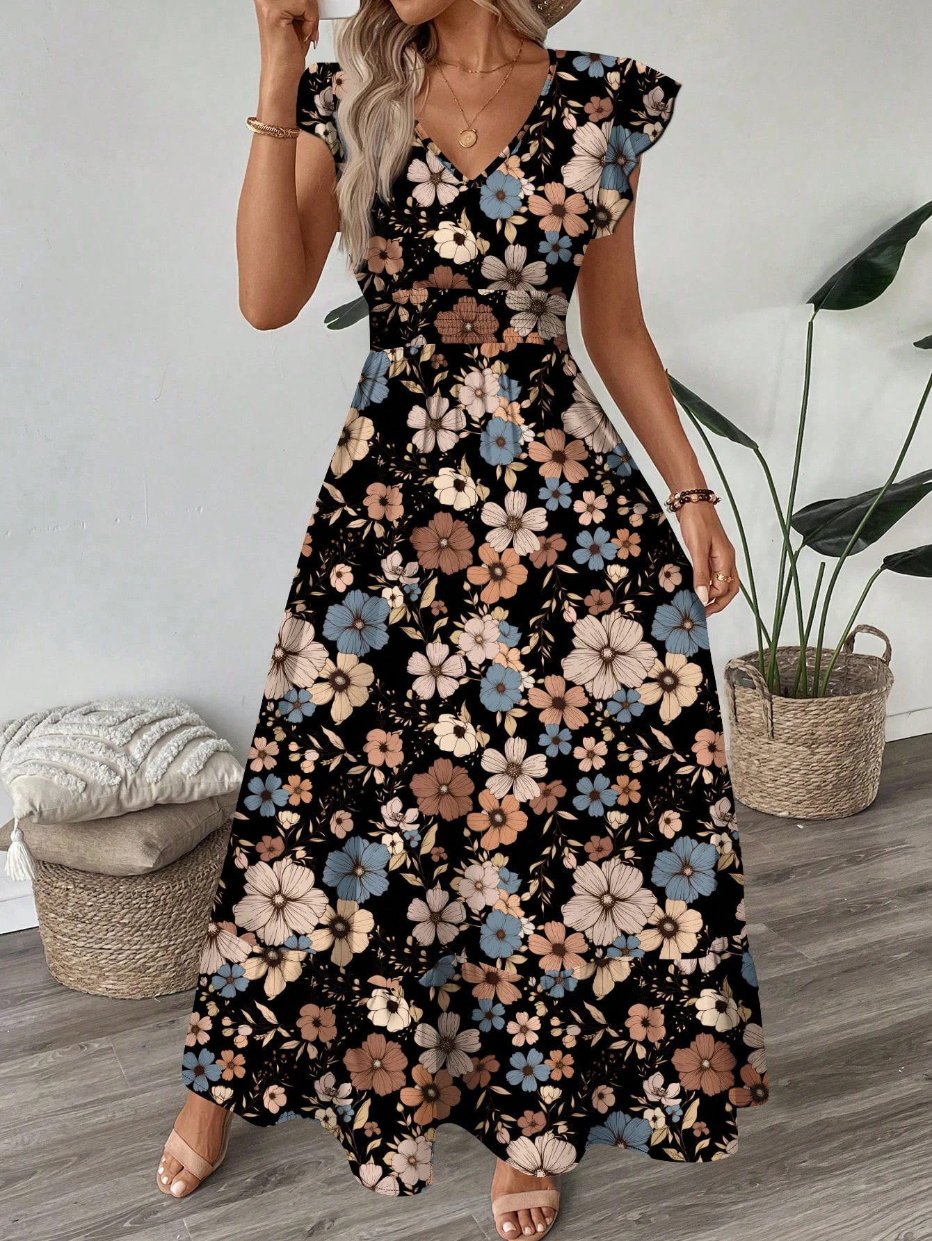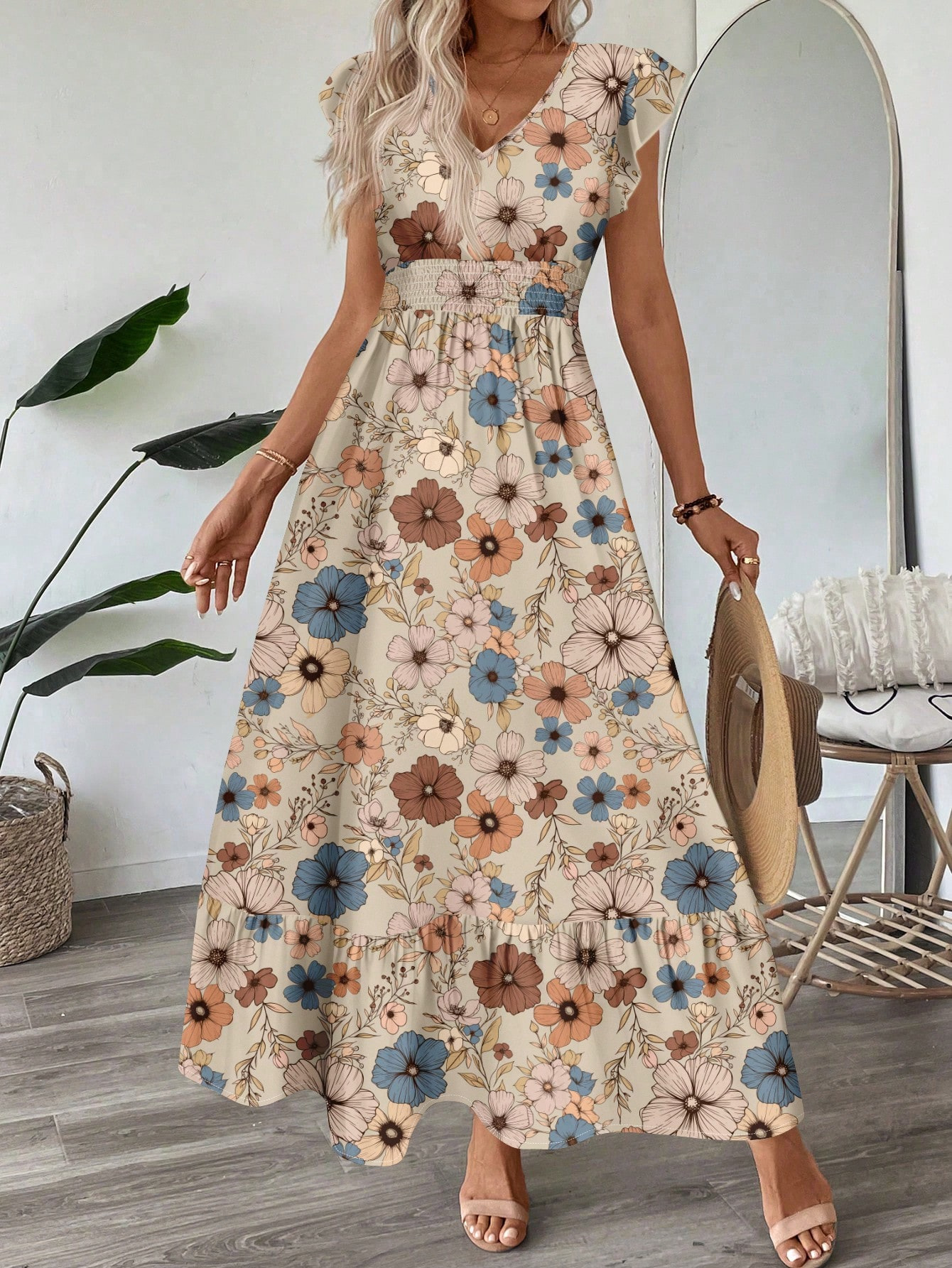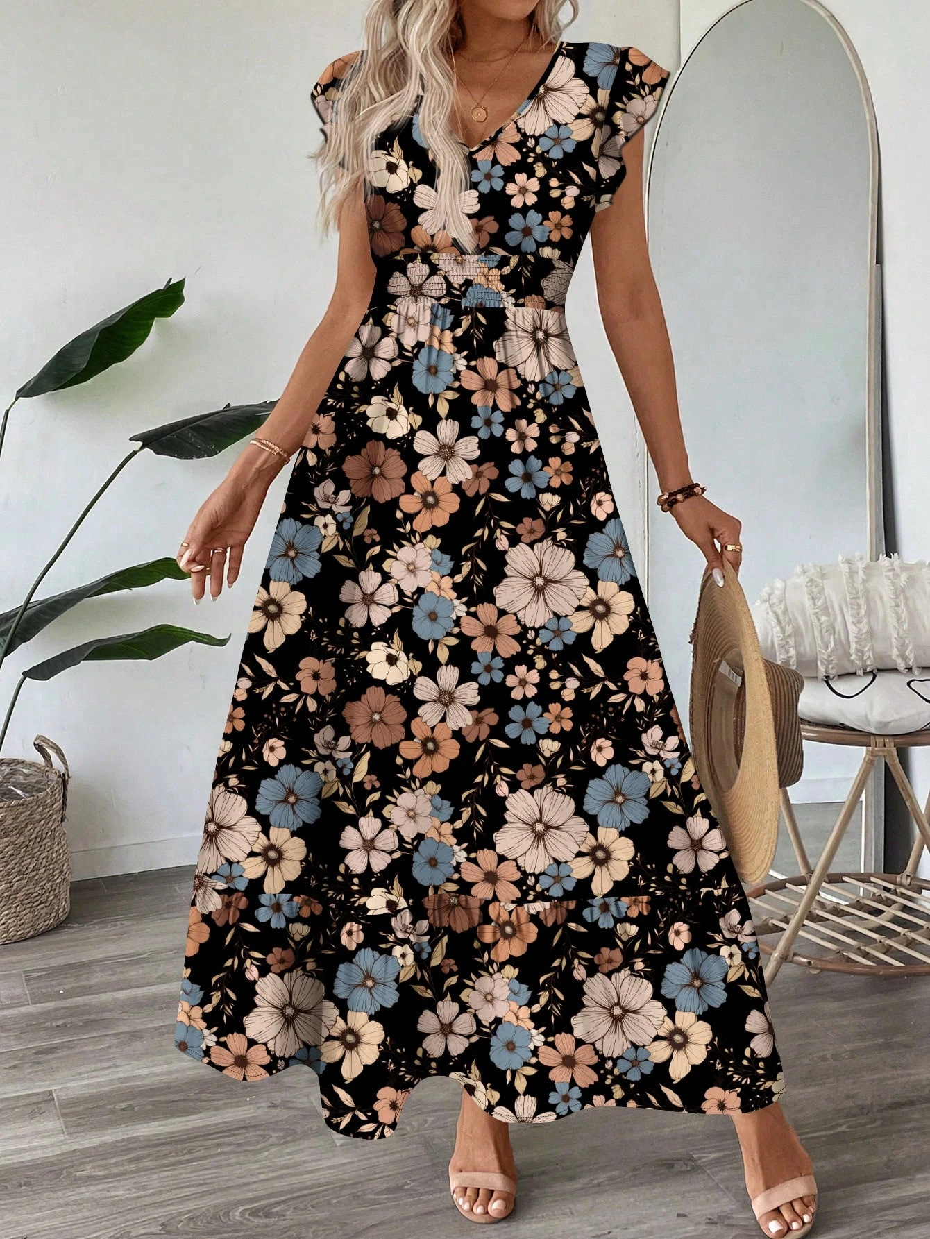 Printed V-neck Flared Sleeve Long Dress