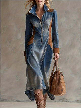 Western Retro Print Lapel Zipper Slim-fit Midi Long Sleeve Dress
